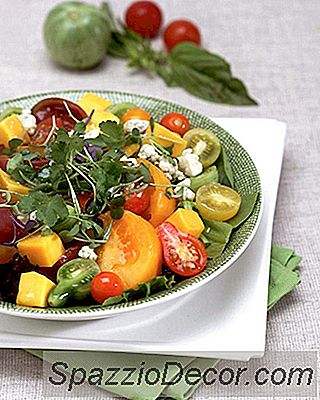 Stap 2: Lijnschotel of individuele ondiepe kommen met babygreens. Top met tomaten. Voeg mango's toe, plaats wat bovenop tomaten en sommige langs de randen. Top met gescheurde basilicumbladeren. Roer dressing en lepel over tomaten en mango's. Eventueel overgebleven verband kan worden gekoeld en gebruikt voor een andere salade, hetzij met een assortiment greens of gesneden fruit (zoals appels of mandarijnen) bovenop gemengde sla.