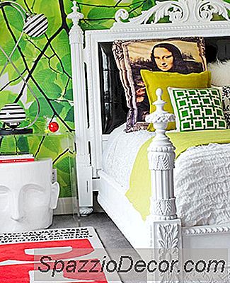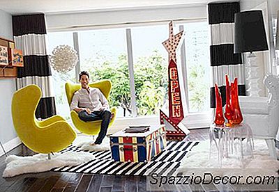 Beginnend met een basis van zwart en wit, creëerde de Design Star een gedurfde ruimte door te accentueren met primaire kleuren. Mod gele stoelen, rode vazen en een vintage selectiekader concluderen dat alle tekens wijzen op een vet "ja!" Tip: Je kunt nog steeds drama toevoegen aan een zwart-witte kamer door met texturen te spelen - een klassieke witte stoel krijgt een funky draai met zijn glanzende afwerking, en harige vloerkleden voegen een vleugje gezellig toe aan de hedendaagse ruimte.