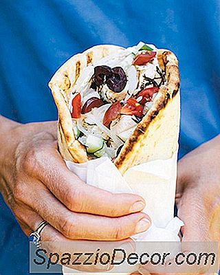 Stap 3: Om de gyros te assembleren, strooi je wat van de citroenyoghurtsaus op elk stuk lavash of pitabroodje, voeg een paar vorken kip toe, en bedek met gehakte tomaten, komkommer, ui, olijven en baby-rucola. Spuit met meer citroensap als je wilt.
