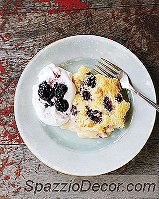 Stap 3: Gebruik in een nieuwe kom, met behulp van schone kloppers en de elektrische mixer, het eiwit totdat stijve, glanzende pieken ontstaan. Vouw het eiwit in het beslag. Giet de custardbes in de beboterde taartvorm en bedek met de bessen. Plaats de custard pan in een braadpan of grote koekenpan (wat past). Voeg voldoende water toe aan de braadpan om halverwege de zijkanten van de taartpan te komen. Bak de custard tot hij in het midden staat en net begint te bruinen, ongeveer 40 minuten. Serveer met verse slagroom en bramen.